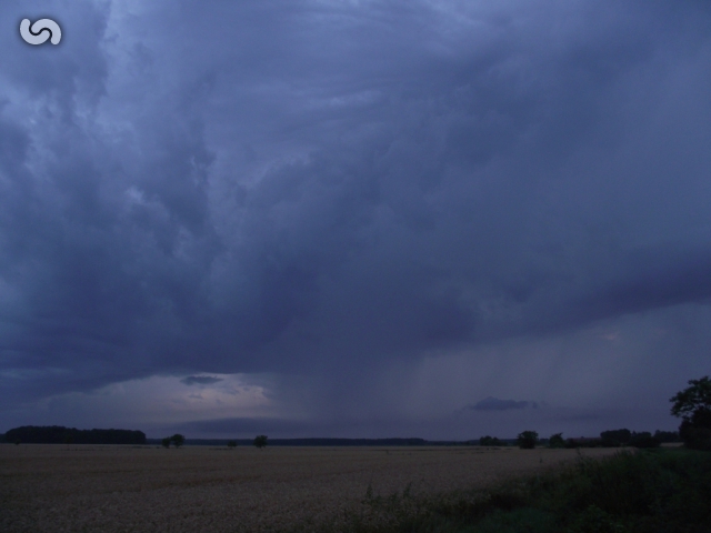 Ilyen feltételek mellett érkezett az a zivatarrendszer, mely délután alakult ki az Alpokban. Az egyik legerősebb, szupercellás góc, mely Graz mellett alakult ki, a délnyugati áramlásból egyre jobban kitérve Szombathely felé vette az irányt, így én is elvonatoztam a város déli határába (Szombathely-Szőlős). Nem sokkal 6 óra előtt értem oda, akkor már nagyszerűen látszott a közeledő cella fő feláramlási tornya a terebélyes üllője alatt, melybe a szárnyfelhő-tornyok felől folyamatosan nőttek bele a gomolyok, az alján pedig már látni lehetett a kavargó fractus-okat.