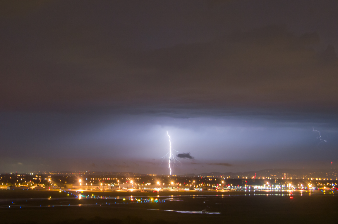 Háromnegyed 2 körül a vihar pillanatok alatt lecsapott Ferihegyre, a peremfelhő mögött rögtön megerősödött a szél (igaz, eleinte még "csak" 60-70 km/h körüli lökésekkel), és pár perc alatt függönyszerűen szakadni kezdett az eső, jócskán 1 km alá rontva a látástávolságot. Nem sokkal 2 óra előtt azonban feltehetőleg egy nedves légzuhatag érinthetett minket, ugyanis a széllökések hirtelen elérték a 100, majd a 120-130 km/h-t, és kisebb méretű jég is keveredett az esőbe. A viharos élményt fokozták a közelben csattanó lecsapók, a szél pedig minden létező és nem létező nyíláson préselte be az esőt a toronyba, ami végül több helyen bázott. A nem várt szélrohamokat sajnos a repülőtér sem úszta meg károk nélkül, de erről majd kicsit később. Emiatt le is kellett zárni a repteret, és végül csak reggel 6 órakor tudott megnyitni újra. 3 óráig még két másik intenzívebb cella is érintett minket, szerencsére ezek már komolyabb szél nélkül, de a másodikból átmenetileg ismét esett jég is. 3 óra után eltávolodott tőlünk a heves rendszer, továbbra is gyakori villámlásokkal kísérve.