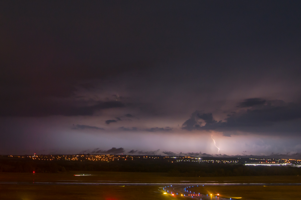 A következő órákban már kezdett labilisabbá válni az égkép, és 9 óra után Kecskemét mellett rövid idő alatt kipattant egy zivatargóc, mely hamarosan egy kisebb, DNy-ÉK irányú zónává terebélyesedett ki, mely felénk közeledett. Ezt eleinte mérsékelt, körülbelül percenkénti villámaktivitás jellemezte, és egy szép kicsapó-lecsapót sikerült is elkapnom. A repteret elérve azonban teljesen legyengült a tömb, így végül csak egy rövid záporra futotta belőle negyed 12 körül.