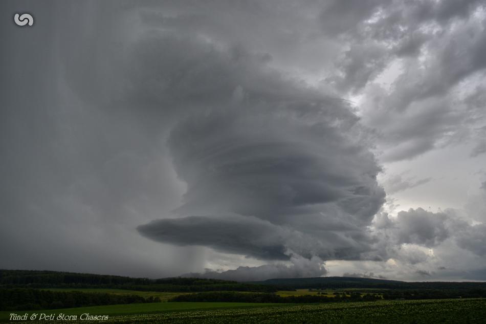 Folytattuk utunkat, izgatottan keresve a megfelelő helyet, ahol megfelelő rálátást találunk. Végül a Szarvas-kúti autóspihenőnél találtuk meg az ideális pozíciót. Sietve rohantunk a fasor mögé, ahol az alábbi látvány fogadott bennünket, egy LP szupercella balra térülő tagja tekeredett az orrunk előtt.