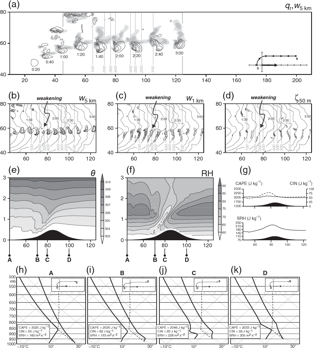 500 m magas hegy esetén a modell kimenet keleti felszíni szélnél (1. ábra b). (a) Esővíz ráta (qr árnyaltan, léptéke: 1 g/kg, 2 g/kg, 4 g/kg, 6 g/kg, 10 g/kg); vertikális sebesség (w fekete vonalak, léptéke: 10, 20, 30 és 40 m/s) az alsó 1 és 5 km-en 20 perces mintavételezéssel (idő: óra: perc formátum). Tengelybeosztás kilométerben. A 100, 200, 300 és 400 méteres szinteket szürke vonalak jelzik. A szupercella mozgását a hodográf x tengelyén vastagon szedett szélvektor mutatja, illetve minden egyes beosztás 5 m/s-os szélsebesség növekedést jelent. A (b, c, d) táblázatok az (a)-ban szürke négyzettel kiemelt területe. (b) vertikális szélsebesség 5 km magasan 10 perces időközönként, melynek beosztása 20, 25, 30, 35 és 40 m/s. A –1K-es potenciális hőmérsékleti perturbáció a legalacsonyabb grid szinten (z=50m) ami a gust front viszonylagos pozícióját is jelzi. A 100, 200, 300 és 400 méteres szintek magasságát szürke vonalak jelzik. A (c) hasonlóan a (b)-hez a vertikális sebességet jelöli, csak z=1 km-es magasságban, melynek beosztása 5, 7.5, 10 és 12.5 m/s. (d) hasonlóan a (b)-hez a legalacsonyabb (z=50m) grid szint vertikális örvényessége (beosztás: 0.01, 0.03, 0.05 s-1). A, B, C, és D szonda és hodográf (h-k). (f) relatív páratartalom (RH; %). (g) CAPE (folytonos vonal), CIN (szaggatott vonal), és SRH. (h)–(k) zivatar nélküli szimulációs eredmények.