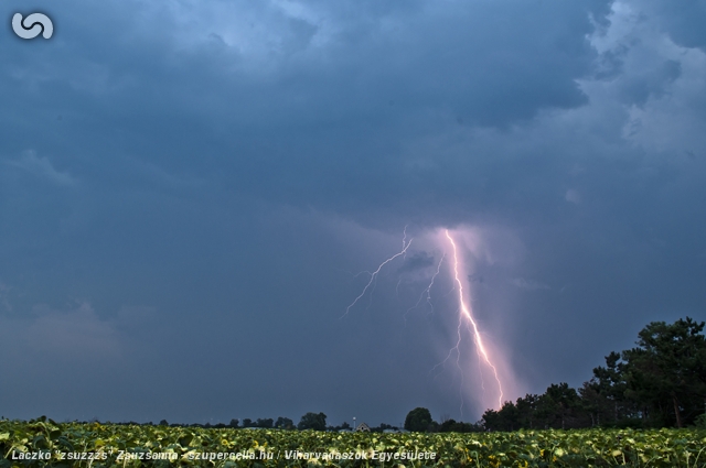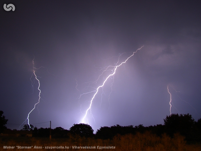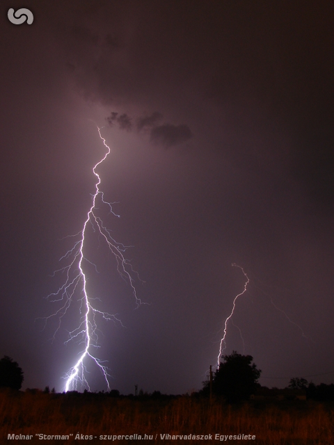 Ezennel is szeretnénk köszönetet mondani Skyshooternek, akitől megtudtuk, hogy nem ajánlatos az M1-esre felmenni Tata előtt, mert oda-vissza le van zárva, így addig a régi 1-esen csorogtunk, utána pedig visszatértünk az autópályára. Itthon még észleltem, hogy tőlem délre újabb cellák alakultak ki, de sajnos rálátásom egyáltalán nem volt a szemben lévő 10 emeletes paneleknek köszönhetően. Nem úgy Storman-nek és Adaznak, akiket még több órás villámparádé kápráztatott el Vecsés city határában, a kisülések tengerében itt-ott megbúvó szupercellás jegyekkel. Az igen lassú mozgású zivatar páratlanul kedvező körülményeket biztosított villámfotózásra, szinte teljesen csapadékmentes környezetben és nagyon hosszú ideig lehetett a mindössze pár km-re csapkodó kisüléseket fényképezni.