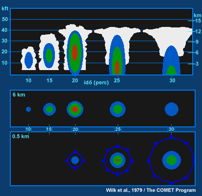 A 17. ábrán egy tipikus egycellás zivatar életciklusa látható, a csapadékintenzitás jellemzésére szolgáló radarechó-eloszlással. A fejlődése során a csapadékintenzitás maximuma mindvégig függőlegesen elnyújtott marad. Ennek oka a vertikális szélnyírás gyengesége (esetleg hiánya), amely miatt a radarechó-maximum nem dől a magassággal. Ahogy a cella leépülő stádiumba lép, a kifutófront minden irányban eltávolodik alóla. |