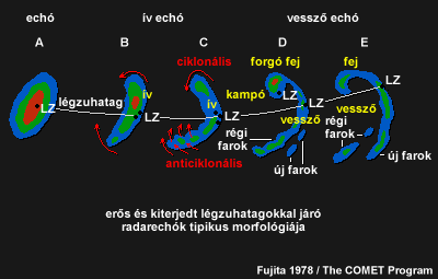 A Fujita által meghatározott ív echó (a radaron ív alakba görbült formát mutató zivatar) a mezoléptékű konvektív rendszerek (MKR) egy különösen intenzív fajtája. Életüket gyakran erős egyedi zivatarként, vagy cellák kisebb vonalaként kezdik, amelyek szimmetrikus ív alakba fejlődnek, majd végül vessző formájú radarechóvá válhatnak. Ez a folyamat néhány óra alatt zajlik le, és a vertikális szélnyírás ebben is fontos szerepet játszik. |